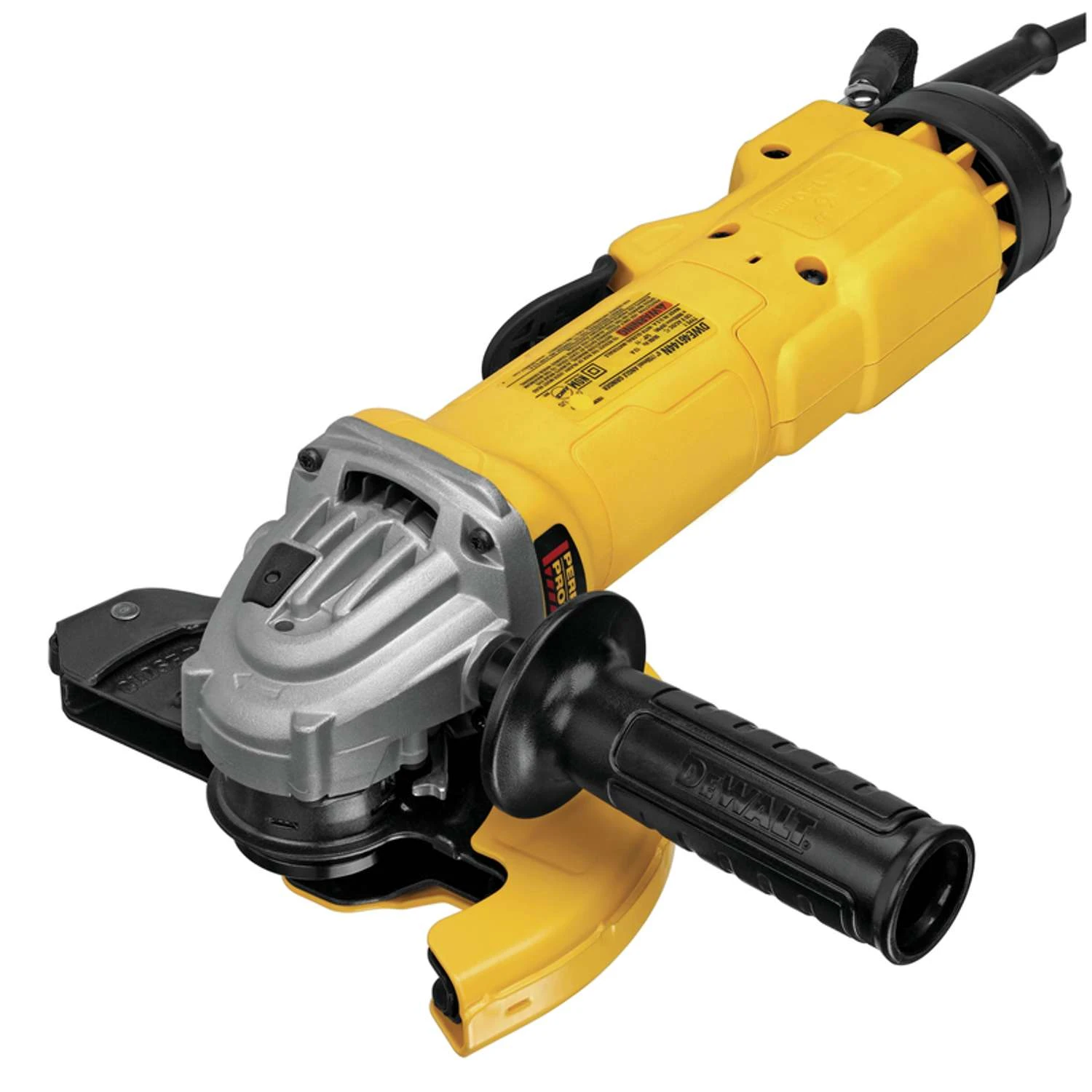 The DWE46144N 6 in. (150mm) High Performance Cut-Off/Grinder combines the features of the Adjustable Type 1 Cutoff Guard with an E-Clutch that shuts the grinder off when a wheel pinch or wheel stall occurs, extending the life of the gears and motor. Dust Ejection System technology clears dust and debris for extra protection. Power tool shuts off before overheating with Power-Off Advanced Overload Protection. E-clutch activates in less than a tenth of a second when a pinch/stall is detected, shutting down the motor Power loss reset prevents accidental restarts following a power disruption when the tool is left in the “on” position Closed position of guard also allows for cutting in tight spots Narrow width of guard provides better visibility to line of cut compared to standard type 1 guard Dust ejection system provides durability by ejecting damaging dust and debris particles that enter through the air intake vents Adjustable from 180 degrees for cutting large materials and closed to 90 degrees for cutting small materials Provides rotations stops to ensure users hands are covered