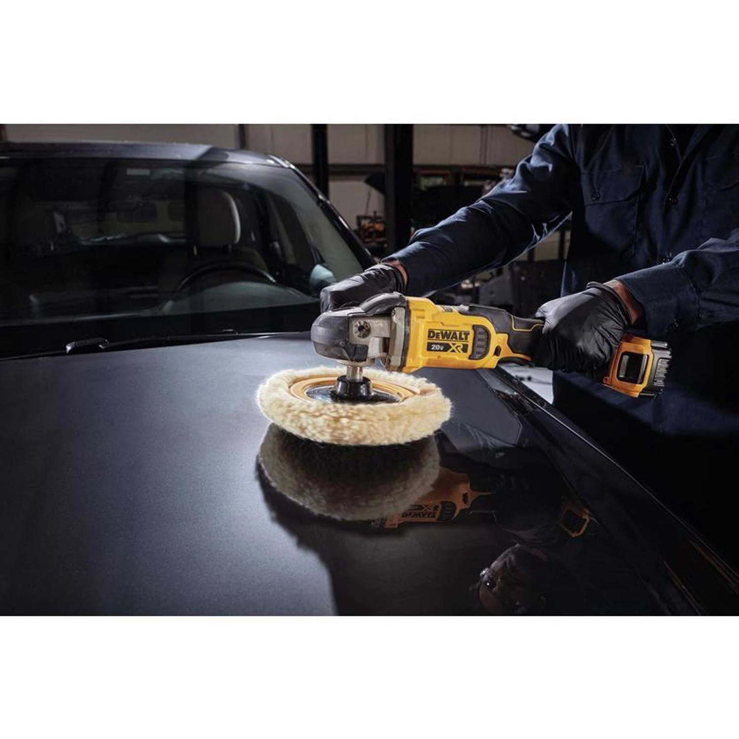 This 7 in. Rotary Polisher features a brushless motor for efficient performance and runtime. No-load speed of 800-2200 RPM with the variable-speed trigger and dial allow for use on cars, headlights, windshields, fiber glass, gelcoat, and for glass-polishing applications. The included 7 in. backing plate is recommended for most applications. Can be held via the front grip or side handle Rubber gear case overmold reduces surface imerfections and improves gripping surface Variable speed on the trigger and dial helps to better control the tool during every step of the application
