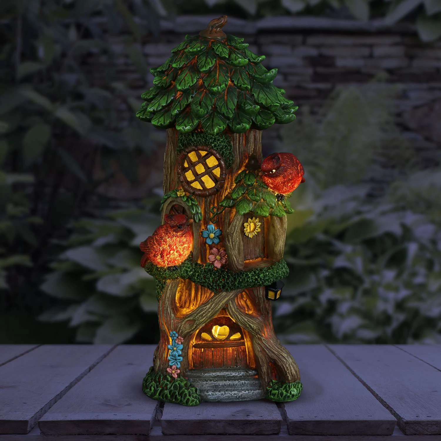 A beautifully hand painted solar fairy tree house makes an endearing addition to your garden! With a leafy roof, red cardinals and carved front door and windows that glow from within, this decor is sure to capture the imagination! Makes a delightful addition to any garden and a wonderful gift idea for the young or young at heart. Beautifully hand painted fairy tree house adds a touch of charm to your garden decor Solar powered LED light provides a decorative glow at dusk Made of durable resin for all seasons