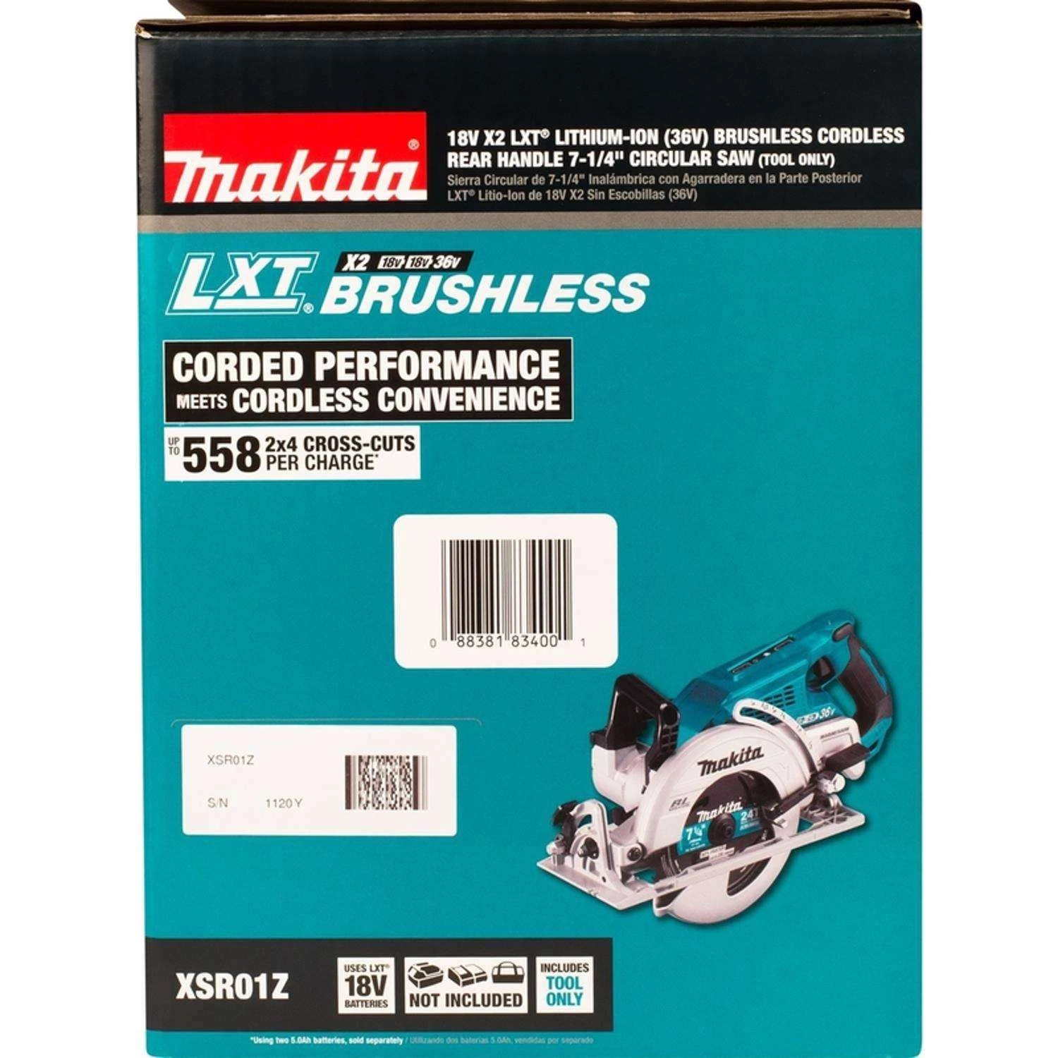 Makita, a pioneer in brushless motor technology and battery innovation, combines both in the 18V X2 (36V) LXT Lithium-Ion Brushless Rear Handle 7-1/4 in. Circular Saw (XSR01Z, tool only, batteries and charger sold separately). It’s powered by two 18V LXT Lithium-Ion batteries for maximum performance and has an electronically-controlled BL Brushless motor that matches torque and RPM to the application. Makita 18V X2 means freedom from the cord, even for demanding applications like cutting sheet and dimensional lumber that traditionally called for a corded saw. Best of all, users can remain in one battery platform, using the same fast-charging 18V batteries with the XSR01Z as they use across the expansive Makita 18V LXT cordless tool series. The XSR01Z has a long list of features for efficient cutting without the cord. Users of leading corded saws will appreciate the blade-left rear-handle design. The electronically-controlled brushless motor delivers a full 5,100 RPM for efficient cutting. In internal testing, the XSR01Z made up to 558 cross-cuts per charge in 2×4 SPF lumber using two fully-charged 5.0Ah batteries. Added features include a large 2-9/16 in. cutting capacity at 90 degrees that will cut 3X lumber in a single pass and an electric brake for maximum productivity. The saw has a die-cast magnesium base and blade guard with die-cast aluminum blade cover and motor housing, which combines durability with less weight (only 12.4 lb. with batteries, sold separately). Ideal for framers, formers, builders, roofers and more Retractable, extra-wide tool hook secures the tool when not in use Dual port rapid optimum charger charges two batteries at the same time Automatic speed change technology adjusts cutting speed and torque during cut for optimum performance